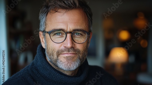 Mature man with glasses wearing a turtleneck sweater, smiling warmly in a cozy indoor setting during daylight