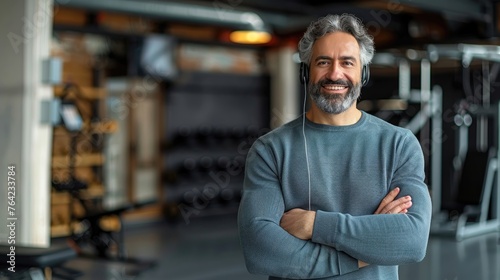 mature, man, earphones, gym, fitness, health, well-being, exercise, blue, sweater, sport, casual attire, relaxed, confident, smiling, strength, training, active, leisure, content, physical exercise, studio, equipment, weight, happy, joy, adult, vitality, lifestyle, middle-aged, music, technology, wireless, athletic, serene, enjoyment