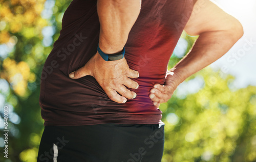 Mature man, workout and back pain with sweat, injury and hands for stretching, muscle ache and inflammation. Outdoor, run and fitness for health, wellness or exercise in sportswear, break or accident