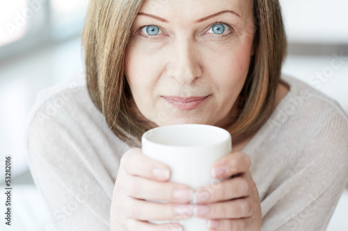 people, person, woman, female, lovely, pretty, charming, lady, attractive, adult, beautiful, beauty, feminine, portrait, lifestyle, caucasian, 1, positive, single, contemporary, aged, age, mature, looking, holding, glance, face, calm, serene, cup, drink, morning, human, finger, natural, charme, make-up, complexion, closeup, closeup, facial, calmness, serenity, healthy, visage, eye, posing, model, gorgeous