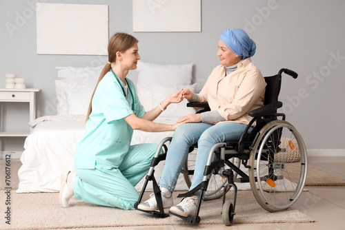 Mature woman after chemotherapy in wheelchair with nurse holding hands at home. Stomach cancer concept