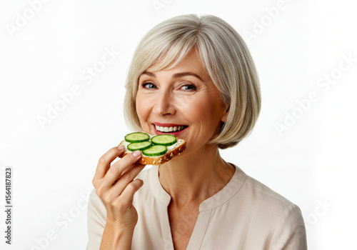 Mature woman eating healthy bread with cucumber slices isolated on white