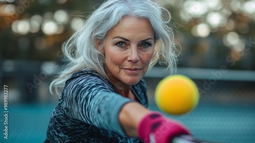 mature woman enjoying a competitive game of pickleball on the court demonstrating her active lifestyle and love for outdoor exercise while staying energetic and athletic in her fitness routine