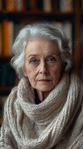 woman, mature, thoughtful, elderly, serious, seriousness, aged, portrait, face, eye, expression, calm, focused, dignified, dignity, intriguing, portraiture, older, womanhood, grey, hair, foulard, knitted, beige, style, warm, cosy, library, book, bookshelf, quiet, interior, elegant, confidence, wisdom, composed, serene, still, intelligence, grace, compassion, empathy, beauty, respect