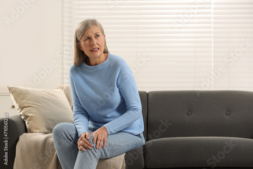 Mature woman suffering from knee pain on sofa at home. Rheumatism symptom