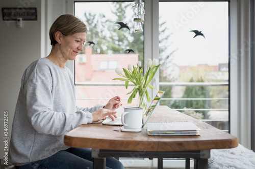 caucasian, one person, mature woman, casual attire, technology, home office, online, wireless, accessibility, telecommuting, wi-fi, home, german, indoor, laptop, connection, working, bouquet, independence, wooden table, sitting, occupation, blond, tulip, tea, teacup, brown hair, confidence, smiling, content, positive, optimistic, people, adult, woman, cyberspace, communication, computer, plant, flower, table, wooden, job, drink, cup
