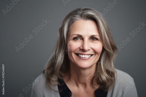 Mature Woman's Radiant Confidence in Gray Studio Portrait. Photo generative AI
