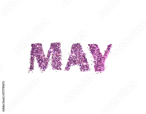 May, name of the spring month of purple glitter isolated on white background