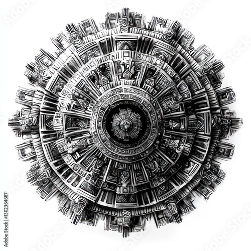 aztec, mandala, circular, design, ornament, pattern, ancient, civilisation, culture, art, sculpture, relief, stone, carving, glyphs, hieroglyph, symbol, mythology, history, mexico, guatemala, architecture, temple, geometric, intricate, detailed, black-and-white, monochrome, abstract, spiritual, mystical, sacred, cosmic, universe, energy, power, tradition, heritage, artifact, decorative, home decor