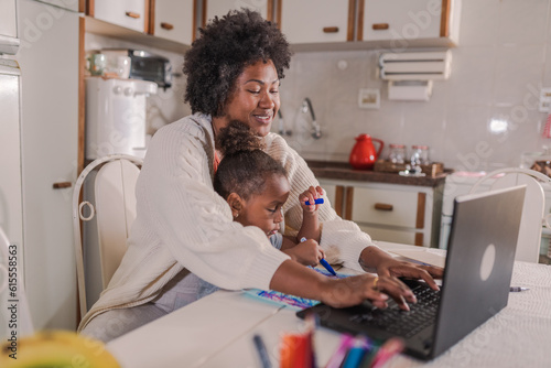 mãe Latina sentada na mesa da cozinha trabalhando em seu computador portátil com sua filha no colo desenhando