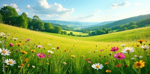 Meadow landscape with meadowsweet and wildflowers, countryside, greenery, scenery