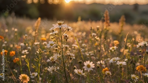meadow, wildflower, field, sunset, sunrise, dawn, golden hour, warm tones, nature, flora, daisy, yellow, orange, white, peaceful, scenic, rural, countryside, outdoors, grass, plant, sunlight, greenery, serene, earth-tone, autumn, spring, bloom, environment, no people, calmness, earth, landscape, closeup, horizon, colours, nature scene, summer, floral, season