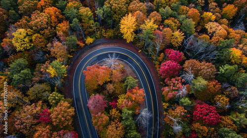 Meandering asphalt road cuts through a dense forest, showcasing vibrant autumn foliage at its peak