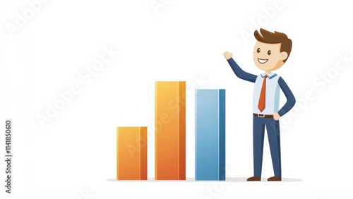 Measuring success and growth assessment concept. Businessman presenting a growth chart with confidence and enthusiasm in a colorful, animated style.