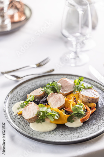 Meat and vegetable with pork medallions, greens and carrot pure with baked carrots