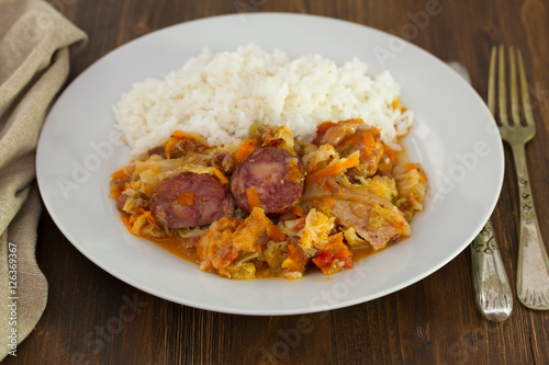 meat with cabbage, beans and rice on white dish