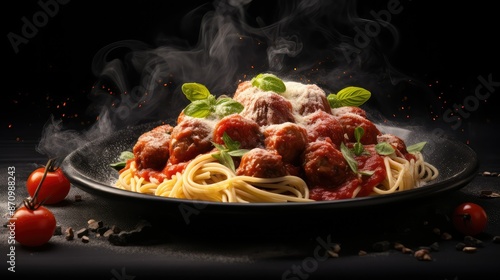 meatball, food, dark, background, illustration, spaghetti, tomatoes, sauce, pasta, steam, appetising, plate, dish, cookery, italian, savoury, delicious, epicure, dinner, meal, culinary, rich, hearty, comfort, homemade, traditional, flavorful, steamy, aromatic, presentation, texture