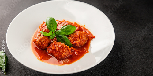Meatballs tomato sauce beef, pork or chicken meat fresh delicious gourmet food background on the table rustic food top view copy space keto and paleo diet
