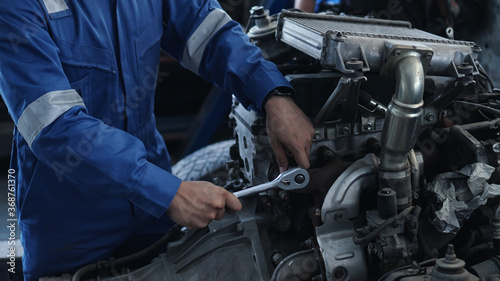 Mechanic auto mechanic in uniform repairing.car in auto machine tools ready to be used with car service.selective focus.