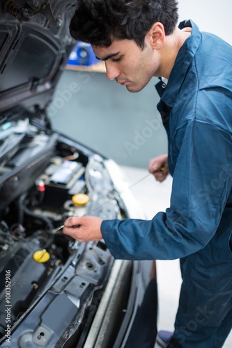 oil, car, focused, auto, repair, the, checking, engine, level, work, garage, transportation, concentration, maintenance, automobile, profession, occupation, examining, coverall, machinist, expertise, repairman, standing, workwear, mechanic, holding, service, bonnet, skill, shop, with, job, at, in, a