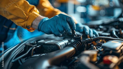mechanic in a modern auto repair shop, using advanced diagnostic equipment to inspect a vehicle's engine, surrounded by state-of-the-art tools and technology, reflecting a high-tech and efficient