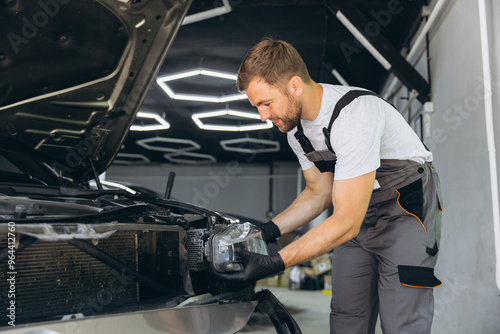 Mechanic Inspecting Car Headlight in Auto Repair Shop with Open Hood