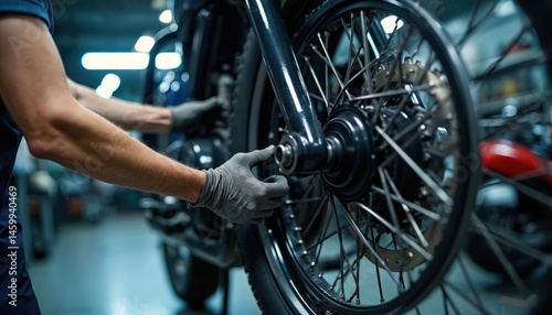 Mechanic installs motorcycle wheel in repair shop. Worker hands with protective gloves at work. Service, maintenance of transport. Wheel replacement concept.