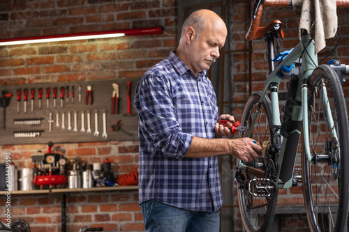 rider, bicycling, tool, repairing, workshop, bike, bicycle, mechanic, garage, fixing, work, man, repair, maintenance, cycle, male, senior, elderly, tool, wheel, craft, equipment, professional, men at work, adult, business, mature, retired, job, repairman, working, crank, craftsman, artisan, inside, indoor, skill, gear, brick wall, chain