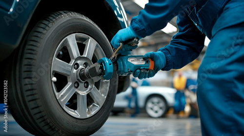mechanic, car, automobile, vehicle, wheel, tire, automotive, repair, service, maintenance, garage, workshop, professional, technician, men at work, tool, equipment, hand, glove, blue, silver, metal, closeup, detail, industry, transportation, engineering, safety, skilled, experienced, job, profession, labor, occupation