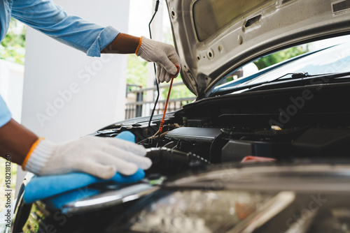 Mechanic wearing gloves inspecting car engine, checking engine oil with dipstick, focusing on maintenance and repair to ensure car performance, safety and efficient car care in the repair shop.