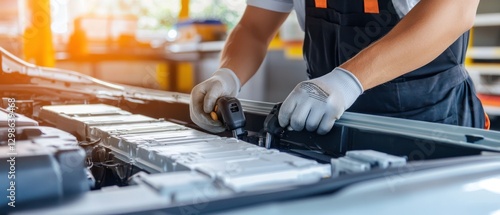 mechanic, car, battery, engine, automotive, repair, service, maintenance, technician, workshop, garage, tool, glove, hand, wrench, closeup, detail, vehicle, electric, hybrid, power, energy, technology, professional, job, industry, transportation, auto, work, equipment, inspection, safety, white, black, grey, orange