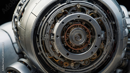 Mechanical Marvel: A close-up reveals the intricate inner workings of a metallic machine, showcasing gears, circuits, and other detailed components.