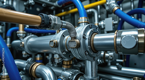 Mechanical parts and pipes connect in this advanced industry setup highlighting technology and precision in complex mechanical system
