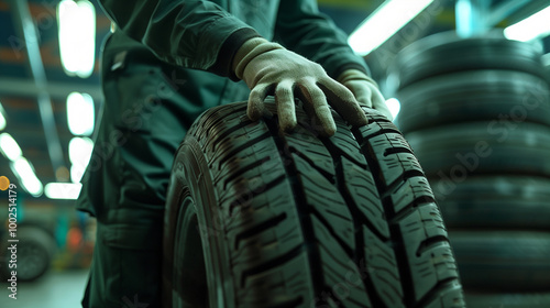 Mechanic's gloved hands handling a tire in an auto repair shop with stacks of tires in the background