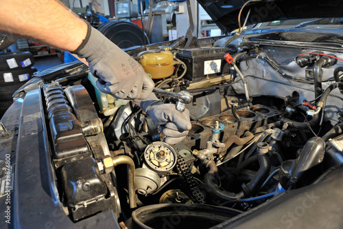car, car, garage, drive, screw, ratchet, hood, engine, servicing, set, garage, workshop, mechanic, cylinder, glove, cable, oil, daub, cool