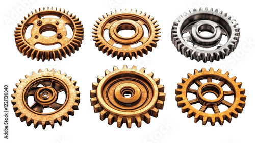 Mechanized Harmony: A collection of intricately designed gears, each bearing a unique metallic texture and arrangement, interlock in a visually captivating composition.