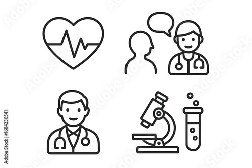 Medical and healthcare outline icon set. Vector pictograms for heartbeat, cardiology, doctor consultation, and lab research. Health symbols for diagnosis and scientific analysis.