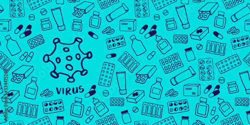 Medical background with virus icon. Medicine seamless doodle pattern. Hand drawn health care, pharmacy, chemical cartoon header. Vector illustrations.