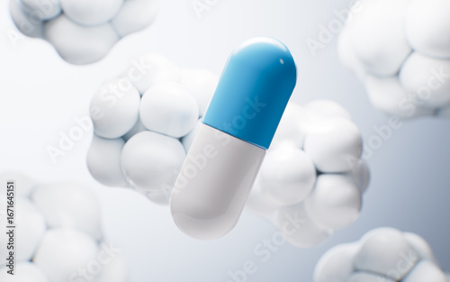 Medical capsule and molecules, 3d rendering.