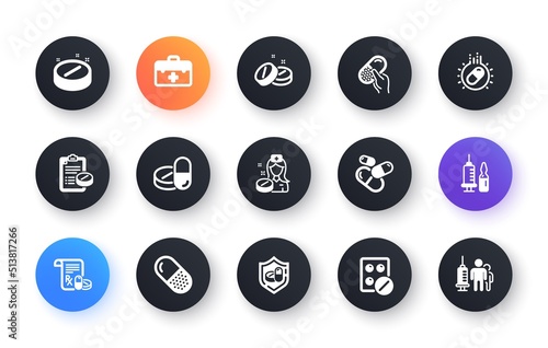 Medical drugs icons. Healthcare, Prescription and Pill signs. Pharmacy drugs, recipe pill icons. Antibiotic capsule, syringe vaccination. Classic set. Circle web buttons. Vector
