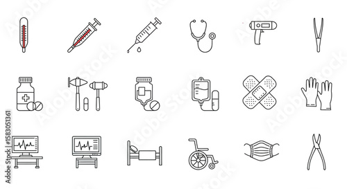 medicals, health, hospital, equipment, stethoscope, syringe, wheelchair, thermometer, diagnostic, vector, outline, first aid, treatment, doctor, nurse, clinic, medical care, patient, injection, emergency, vaccine, physical therapy, recovery, infusion, drug, disabled, surgery, disease, medicine