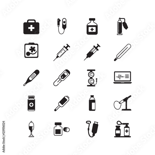 medicals, icon, vector, silhouette, set, hospital, pharmacy, medicine, stethoscope, syringe, design, web, health, health care, first aid, symbol, emergency, treatment, doctor, nurse, clinic, medical care, prescription, medical equipment, drug, wellness, health care, graphic, icon, illustration, business, science, nubes, aid, tool, box, bottle, container