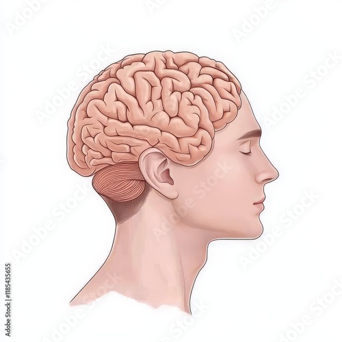 Medical illustration of a side profile human brain with detailed anatomical structures, highlighting cognitive science, mental health, and advancements in neurology research