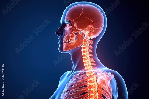 Medical illustration of the human body with red - highlighted skull and spine, set against a blue - transparent background, ideal for educational, medical, and skeletal - related materials.
