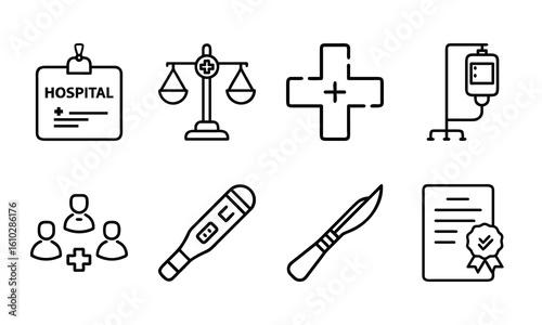 Medical Line Icons Collection – Doctor Coat, Thermometer, IV Drip, CPR, Hearing Test, Medical Ethics, ID Badge, and Healthcare Cross Symbols for Apps, Websites, and Infographics