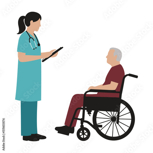 medicals, professional, doctor, nurse, patient, wheelchair, assistance, care, support, health care, hospital, clinic, silhouette, illustration, vector, graphic, design, elderly, disabled, accessibility, inclusion, health, medicine, treatment, help, aid, caregiver, black, and, white, monochrome, greyscale, simple, clean, minimal, artwork
