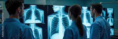 Medical professionals analyzing X ray images in a modern hospital setting, emphasizing teamwork and advanced diagnostic technology.