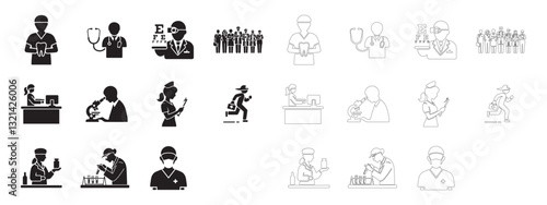 dentist, eye doctor, physical therapist, health care, medicals, doctor, nurse, physician, eye doctor, apothecary, scientist, researcher, technician, patient, hospital, clinic, laboratory, silhouette, black-and-white, monochrome, illustration, vector, treatment, diagnosis, prevention, medicine, care