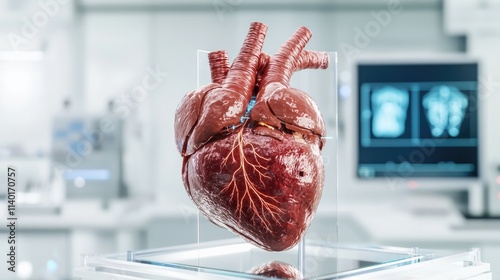 Medical prosthetics concept. 3D model of a human heart displayed in a medical laboratory setting.