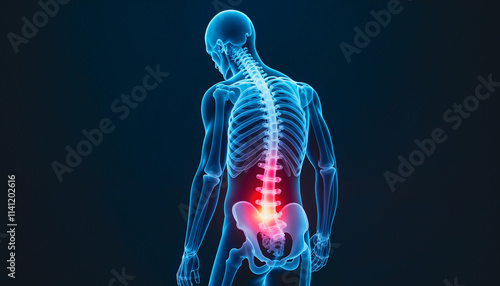 Medical rendering of a skeleton emphasizing the lumbar spine, illustrating back pain or injury. Useful for depicting medical, health, or anatomy-related topics like spinal issues and chronic pain.